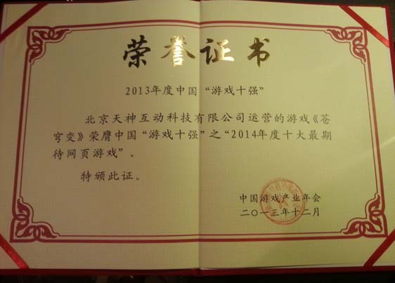 2013年12月27日,天神互动凭借PC页游《苍穹变》喜获中国游戏产业年会”2014十大最期待网页游戏”。 作为唯一的国家级游戏行业奖,中国“游戏十强”享有中国游戏业至尊美誉,有业内人士指出,赢得中国“游戏十强”桂冠,就是赢得了玩家和业界双重认可。