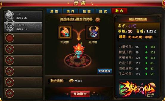 除了境界提升、技能学习,还有独特的灵兽融合系统,能够将两只灵兽融合成一只更强的灵兽,这是唯一能够提升灵兽天赋的方法。同种灵兽天赋相同的相融合,将会有概率提升主灵兽的灵兽天赋,灵兽天赋最高10级,之后融合将不会提升灵兽天赋。要注意,宠物是不分性别的哦,任意两只宠物都能够进行融合。