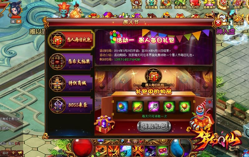 在活动期间,玩家每天可以在愚人节活动界面免费领取一个节日礼包,灵气果、强攻丹、密宝钥匙等等丰厚的奖励让玩家在节日期间可以肆意挥霍,尽享欢乐。赶快来登陆领取吧。