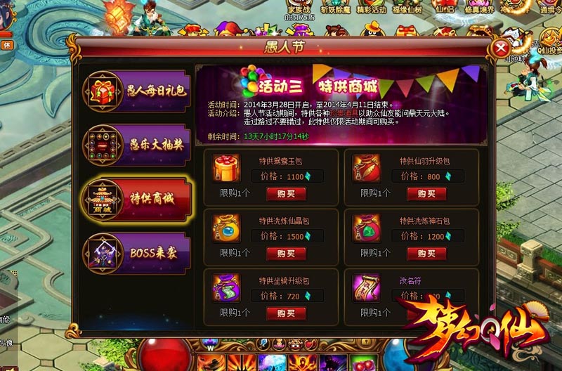 除了以上大礼,只有在愚人节期间才有的特供商城,为玩家准备了各种珍贵道具,鸳鸯玉、仙羽、坐骑升级等五大特供礼包,还有珍贵的改名符,以助众仙友能够早日问鼎天元大陆,走过路过千万不可错过呀!