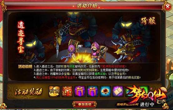 在活动中,玩家的视野受限,仅有近身区域可见,玩家扮演的寻宝者将在漆黑未知的遗迹中进行探索,通过寻找开采宝箱,获得丰厚的奖品。在寻宝的过程中,玩家不但需时刻躲避遗迹中的各种怪物(怪物会攻击玩家却不能被攻击),还需提防其他寻宝者通过活动特定技能来加以阻挠和谋害(玩家可使用技能将自己身边的怪物引向其他玩家)。该活动交互性、可玩性极强,令玩家于斗智斗勇中获得畅快的活动体验。