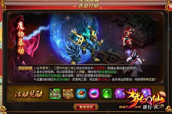 魔物暴动是家族团队活动,需要4位玩家共同进行。活动开始后,在风蚀之地,灵源洞二、三层地图中将会有大量魔物从撕开的时空裂缝中汹涌而出,玩家需要团结家族中的道友去对抗异世界魔物的侵袭,击败魔物的玩家即可增加家族经验以及个人家族贡献哦。