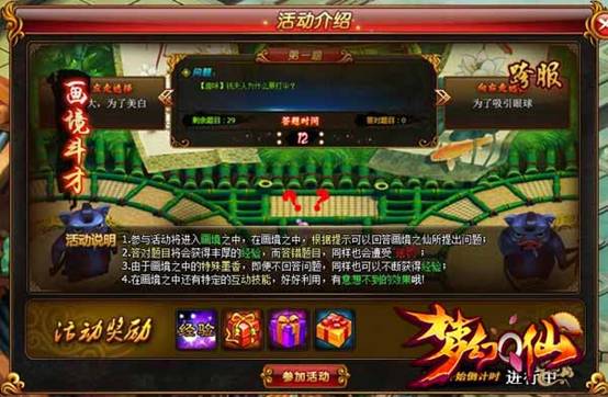 修仙大能者不仅仅需要莫大的耐力,亦需要盖世的智慧方能登临天元之巅。画意之仙特开“画境”,以古今难辨之题会天下有才之士!画境斗才是一起答题活动,在答题过程中不仅需要玩家的智慧,更是要随时注意应对其他玩家的打扰。