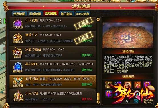 进入活动后玩家将被随机分配到仙宗、邪宗的其中一方进行战斗,在活动中成功击败敌对阵营的玩家或占领地图中的旗帜可以获得个人积分以及阵营积分。阵营积分多的阵营为胜利方,胜利阵营的所有玩家可获得丰厚奖励,个人积分最高的五位玩家可获得的排名奖励。