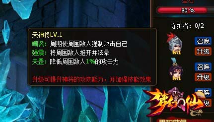 天神将具有强大的嘲讽技能,可以帮助玩家将漏网之鱼转移攻击目标,同时还具有眩晕、削减敌人攻击力等实用的辅助技能。