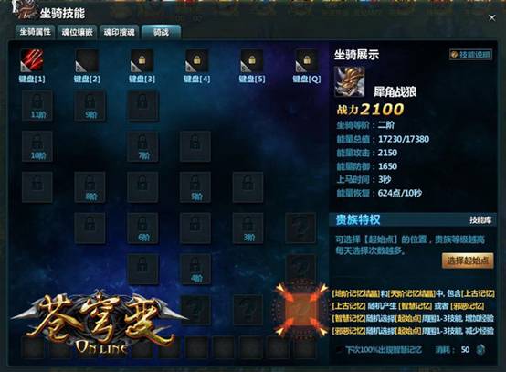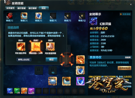 学习和升级骑战技能,需要使用记忆结晶以及经验结晶,玩家可以通过黑市商城和家族藏宝阁兑换。在骑战系统界面,玩家可以将记忆结晶拖入名为“起始点”的发光格子处,然后就会弹出“技能选择”窗口,共有三个选择,两边的技能是二选一。