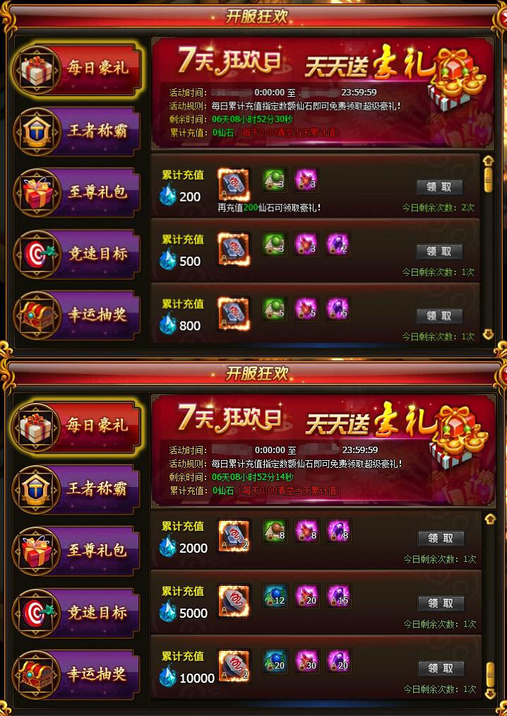 每日累计充值指定数额仙石即可免费领取超级豪礼!(温馨提示:每天的0:00会清空当天的累计值,所以各位仙友记得及时领取豪礼哦~)