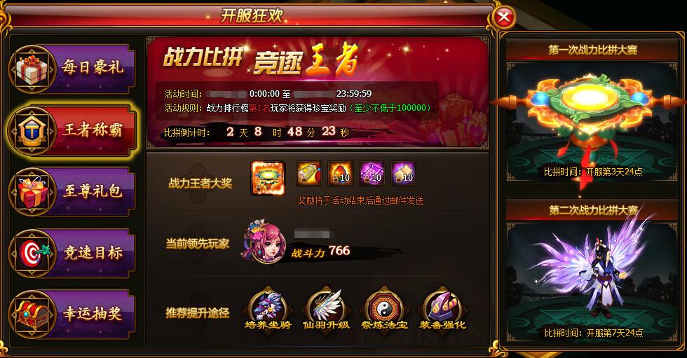 战力排行榜第一名的玩家将获得稀有珍宝奖励(温馨提示:参与战力至少不低于10W,奖励将会通过邮件发送,记得留意~)