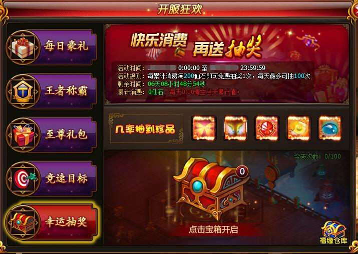 每累计消费满200仙石即可免费抽奖一次,每天最多可抽奖100次,海量稀有道具等你来抽~(温馨提示:仙友们消费了记得抽奖哦,因为每天0:00会清空当天的消费累计值~)