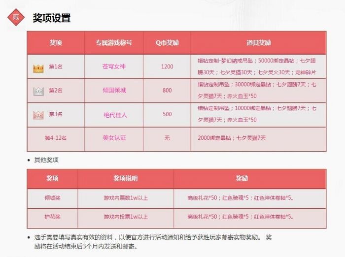 比赛从2014年8月15日开启官网报名,美女玩家们可以通过官网进行报名,经过简单的审核,其他玩家就可以在“苍穹女神”活动页面上欣赏到美女们的风采啦!海选将持续5天,角逐出的前12名美女玩家,将会出现在游戏里,进行最终决战!