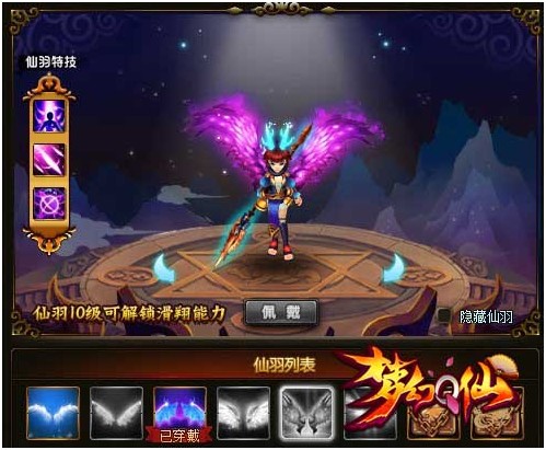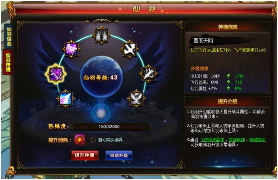 游戏独特的仙羽成长系统,将观赏性和实用性相结合。仙羽不但拥有超炫的外形与特效,还会让人物角色拥有短暂的飞行功能,实现跨越副本地形、PK位移截杀等强大功能。不断进化的仙羽外形也会越来越华丽,附加的属性和技能也会随着增强。