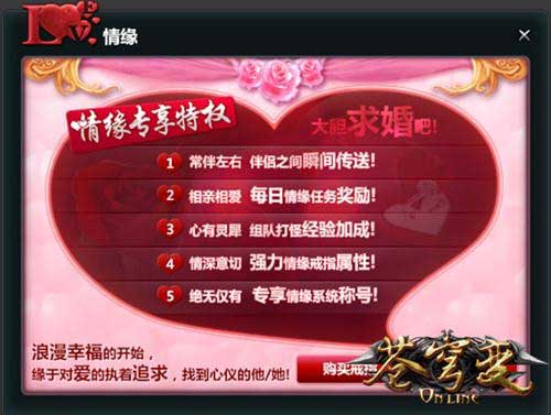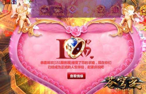 “好姐妹”?“好基友”?……NO!现在开始拒绝异性恋,性别不同怎么谈恋爱!《苍穹变》温情“结婚系统”,给自己的爱情一个正当名分吧。要想走近“合法”的婚姻殿堂,首先要准备好两枚相同品阶的求婚戒指,不同品阶的求婚戒指,可以带来不同的属性加成,当然,结婚后戒指无法更换哦。其次还要准备好999朵玫瑰,在求婚的时候使用。想要结婚的伴侣需要组队,来到结婚NPC处申请。队长默认为求婚者,在求婚仪式上失败将会损失999朵玫瑰,并有30分钟冷却时间,期间内无法再次求婚。