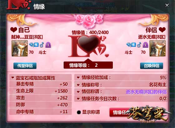 求婚成功,喜结连理之后,结婚双方将获得专属的系列福利!组队打怪将可以额外获得经验加成,专享的情缘任务可以获得大量奖励,并且还可以提升情缘等级。情缘等级越高,对结婚戒指属性的加成就越大,经验加成也越高。大量的结婚福利,让朋友们能够更加珍惜幸福美满的婚姻生活!
