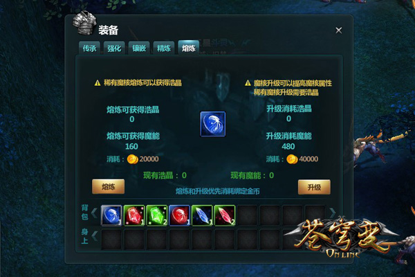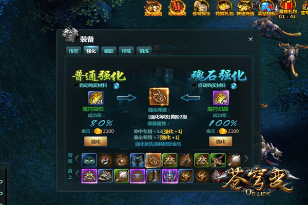 在玩家角色到达20级时,丰富的装备系统就会自动开启,通过击杀野外怪物、精英怪物、世界BOSS都会掉落装备, 怪物等级越高,爆落的装备等级越高。此外,参与幻境罗盘、装备副本、家族活动、限时活动等都有机会获得高级装备。获得了好的装备自然就是要强化啦!玩家可以通过装备系统【传承】、【强化】、【镶嵌】、【精炼】、【熔炼】五大功能,打造个人专用属性的战铠,让战斗力更上一层!