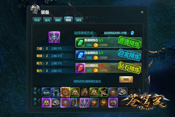 接下来玩家还可以把装备拿来【精炼】,通过普通精练、白金精练、钻石精练,三种不同的精炼方式进行洗点,提高装备基础的属性值,打造自己最喜爱而又强力的帅气战甲!当然,装备等级越高,精练属性的上限越大。