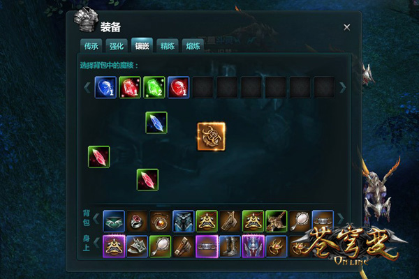 除了【精炼】之外,《苍穹变》装备系统特有的【镶嵌】系统也可以提高装备的属性值,游戏中玩家可以获得各式各样带有属性加成的魔核,通过对装备开孔后即可镶嵌,提升装备的属性,不同等级不同品阶的装备对应不同的开孔上限。
