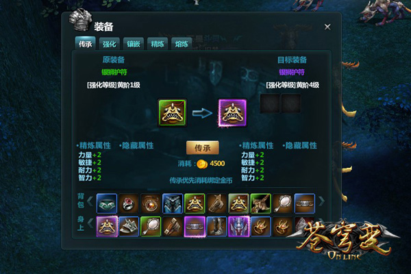 经过这么一系列的精心打造,却得到了更好的装备,难道要放弃之前的心血吗?当然不会!装备的【传承】就解决了玩家的这些烦恼。玩家可以将已经提升过的所有附加值全部转移到新的装备上,保留之前的努力,还可以大大节省重复的开支!